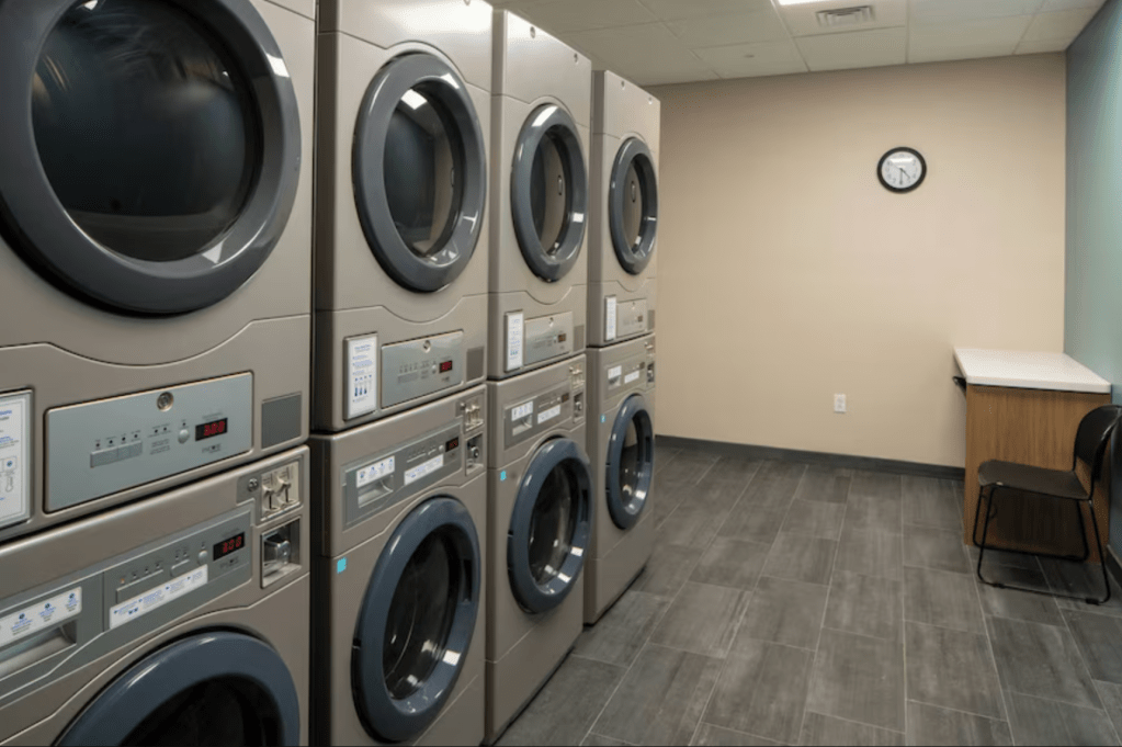 The laundry room is located on the ground floor at the end of the courtyard corridor, just across from the Motion Center and indoor pool.