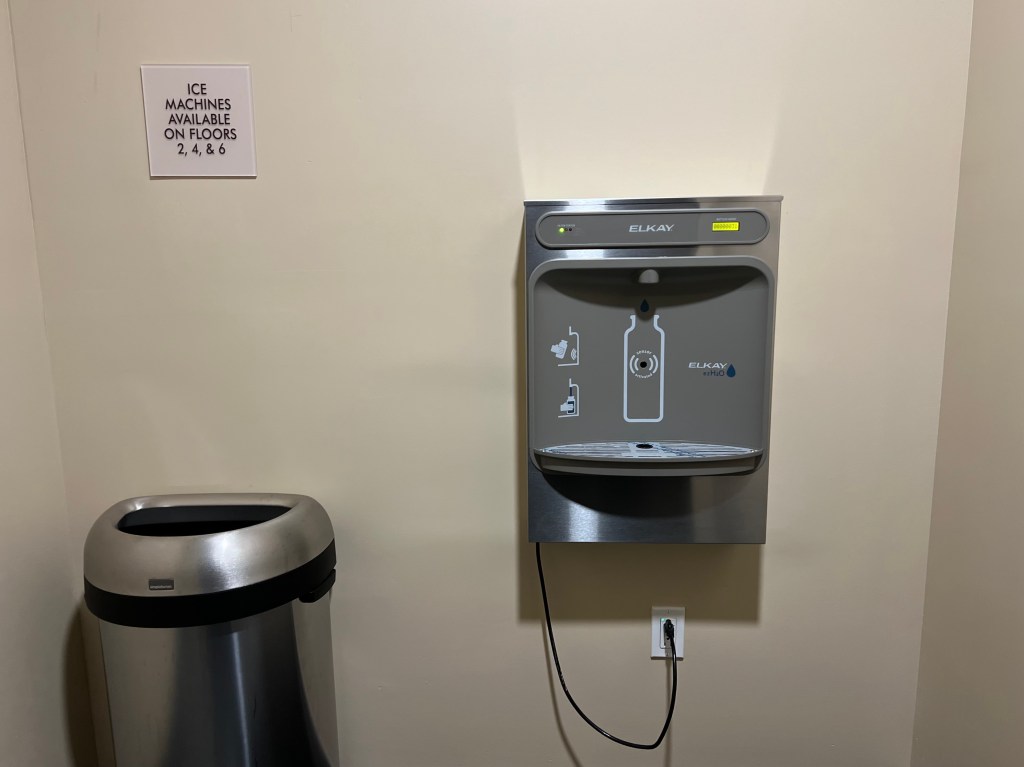 On the even-numbered floors, every ice machine has a separate water dispenser. On the odd-numbered floors, each has a standalone water station.